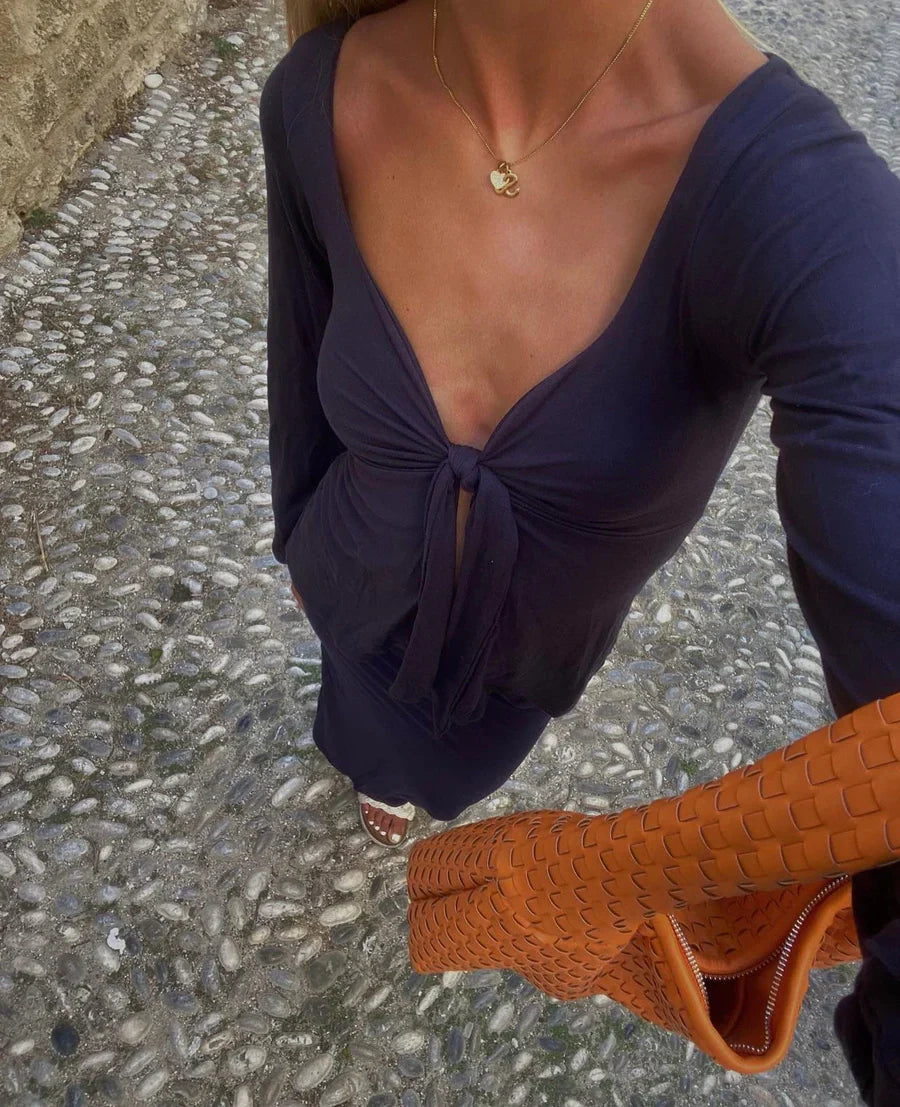 Stil møter komfort: Den knytede fronten gir en feminin silhuett samtidig som stoffet føles lett og deilig mot huden.